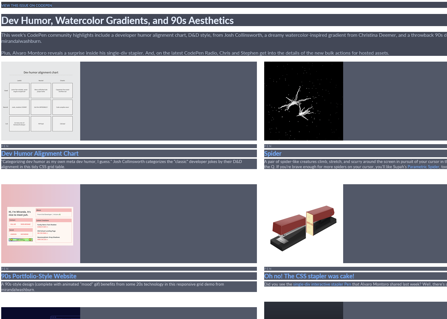 The CodePen Spark is a fairly big deal for CodePen. It goes out every week to millions of developers. The 2nd most popular email client to open The Spark is Outlook, just behind Gmail. You probably know this: Outlook is the worst. It’s solely the thing that keeps HTML email development painful. The thing that requires <table> markup because of how many limitations it has. Without it, HTML email development could take a leap forward.